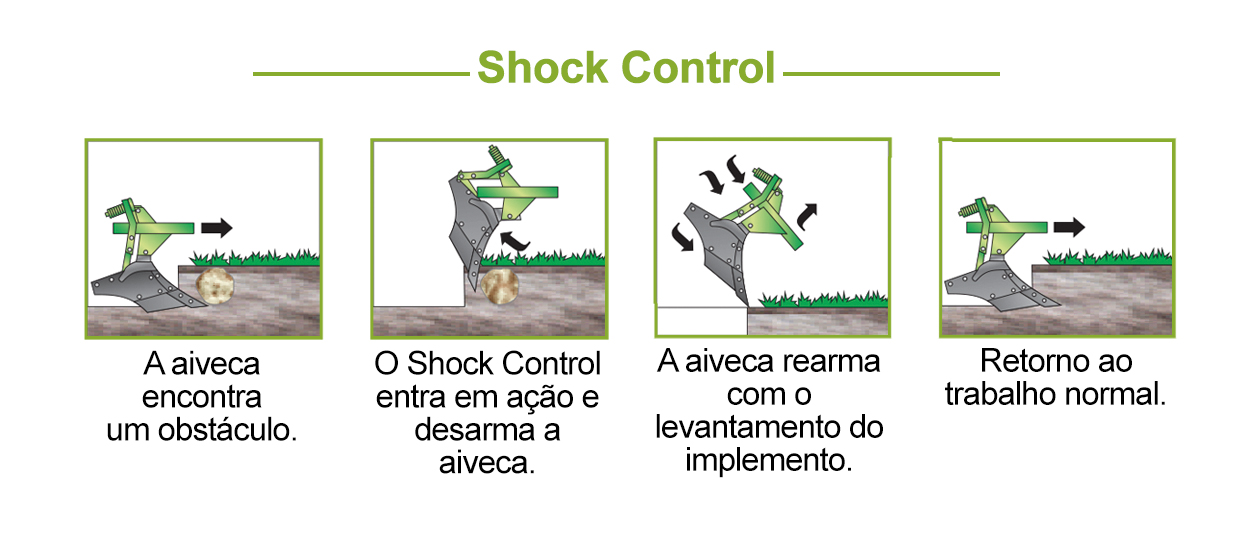 Equipado com shock control que desarma quando a Aiveca encontra um obstáculo e rearma automaticamente com o simples levantamento do implemento.